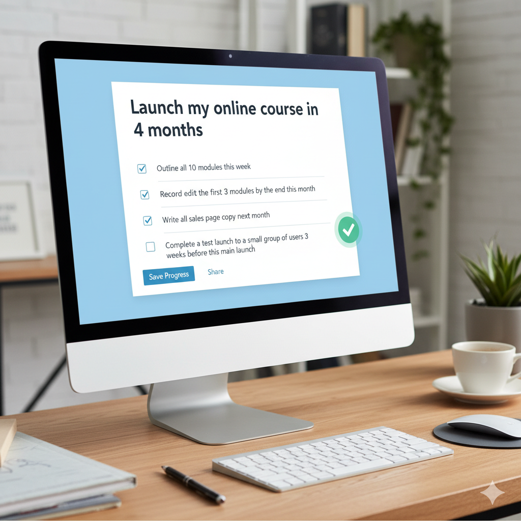 - Define “Success”: What does success look like for this specific goal? (e.g., “Launch my first e-book by the end of Q1,” or “Get 1,000 subscribers to my newsletter.”)